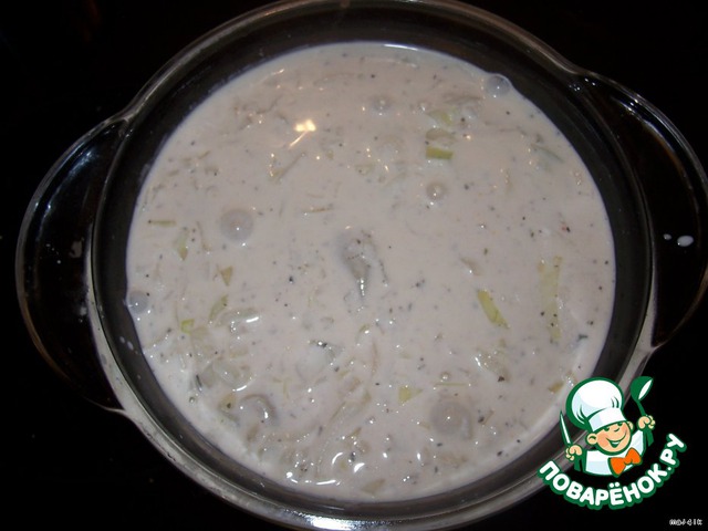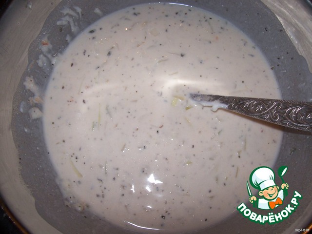 Мелко порезать луковицу и добавить в сметанную смесь. (Опять же маленькое примечание - для тех кто не любит когда, как говорит мой муж "лук немного хрустит на зубах", можно его вообще не класть, или натереть на тёрке, хотя я такой "хруст" очень люблю. :-))