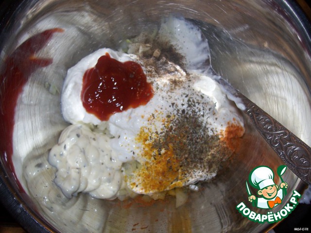 В мисочке смешать сметану, майонез, специи и кетчуп.