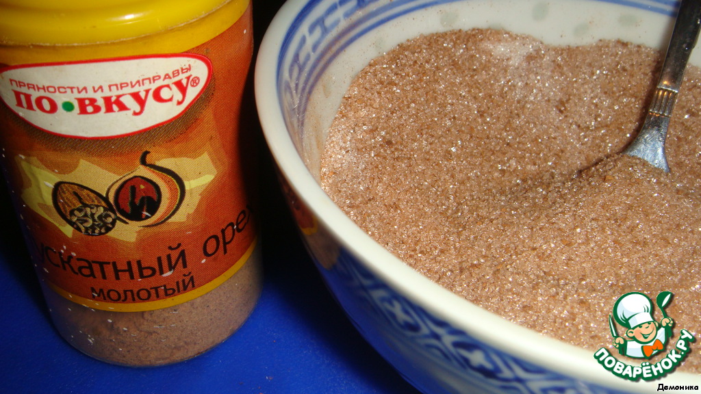 В отдельной мисочке смешиваем корицу, мускатный орех и сахар. Сахар может быть и коричневым.