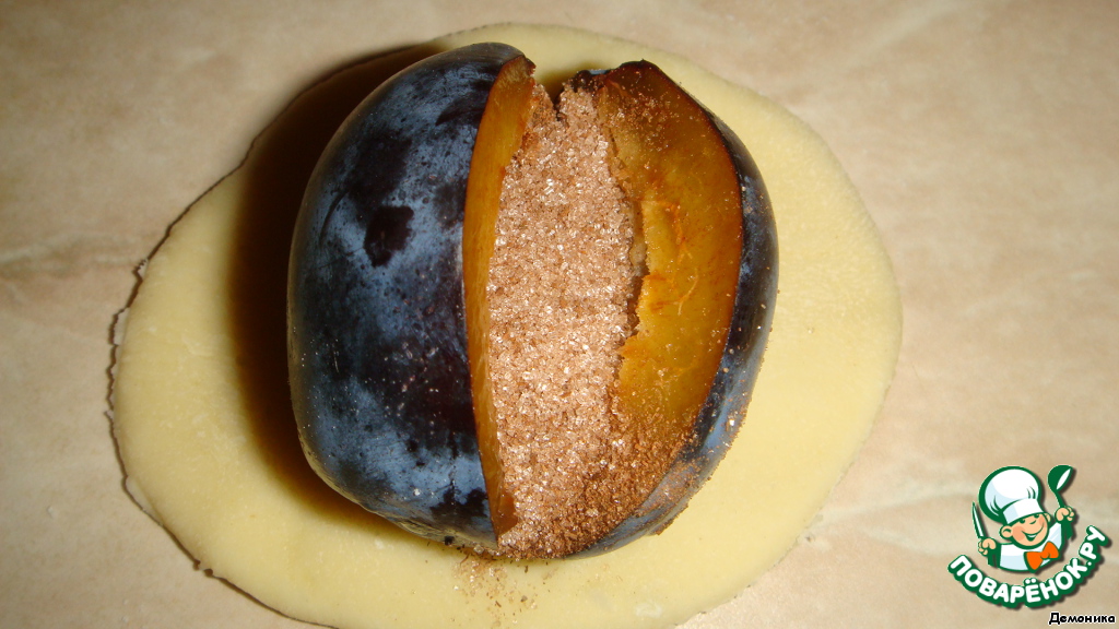 Берём сливу и насыпаем внутрь неё не менее 0,5 чайной ложки смеси корицы с сахаром. Створки сливы плотно закрываем и кладём на один кружок.
