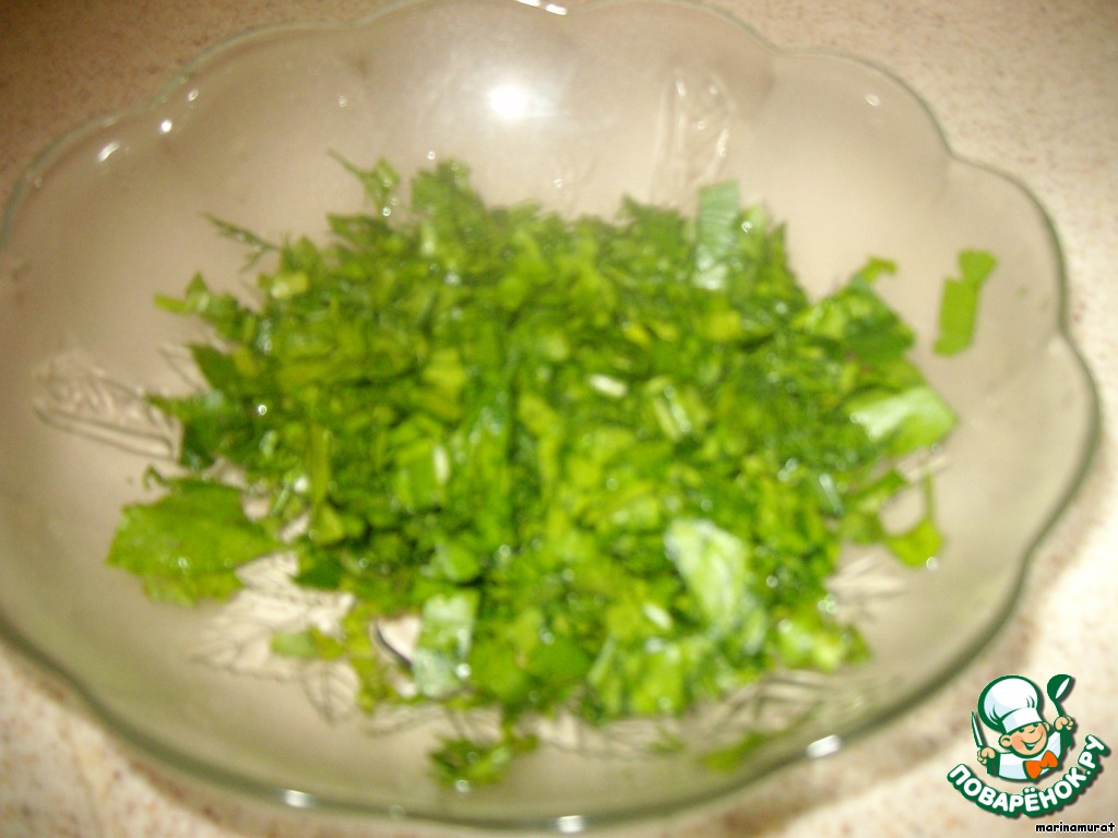 Порежем мелко нашу зелень. Здесь подойдет все, что есть в холодильнике, любая зелень.