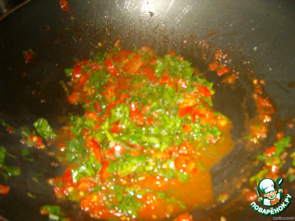 Помидоры я закинула в блендер и сделала пюре. Можно мелко порезать. Также мелко режем и перец. Разогреваем сковородку, наливаем масло, забрасываем наш перчик, слегка обжариваем, добавляем помидоры, тушим минут 5 и выключаем. Добавляем дольку чеснока (чeрез чесночницу) и зелень, солим, перчим, перемешиваем. Начинка готова.
