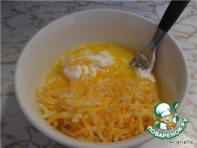 Смешать половину сыра, сметану и яйца, залить рисо-мясную смесь.