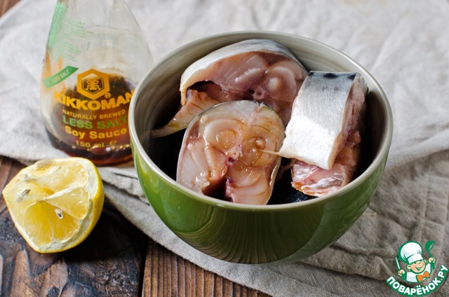 Скумбрию выпотрошить, промыть и нарезать кусочками. Уложить ее в миску и замариновать в 2 ст. л. слабосоленого соевого соуса Kikoman.
