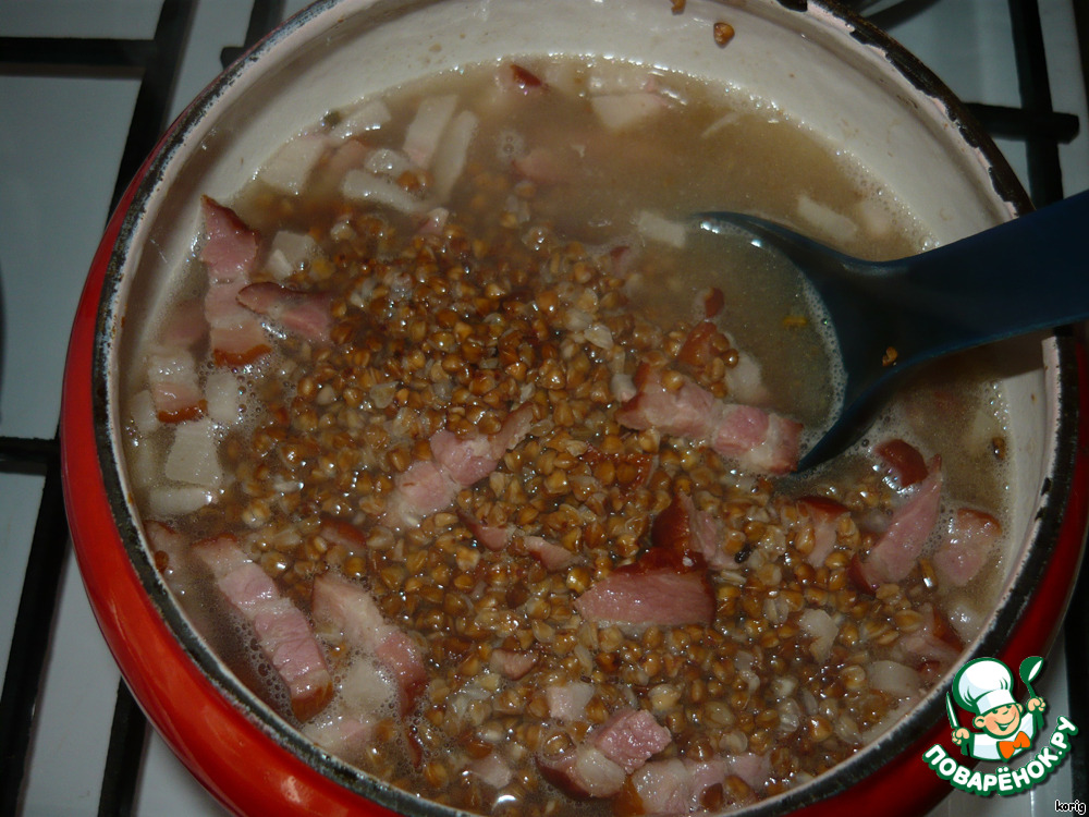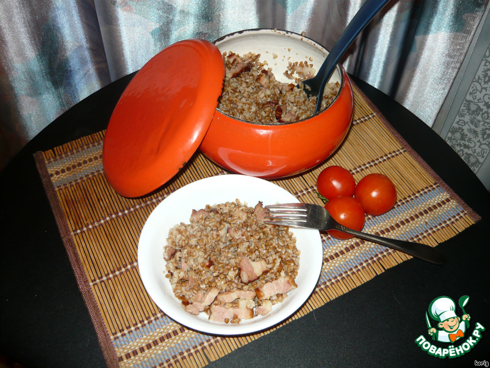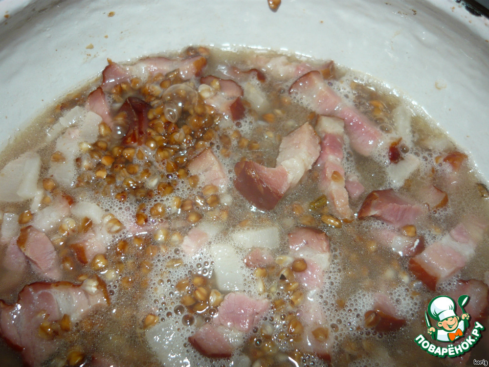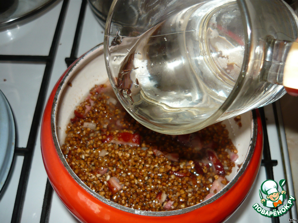 Выкладываем гречку к бекону, хорошо перемешать. Сразу отмеряем 1 полную кружку кипятка. Вливаем в горшочек.