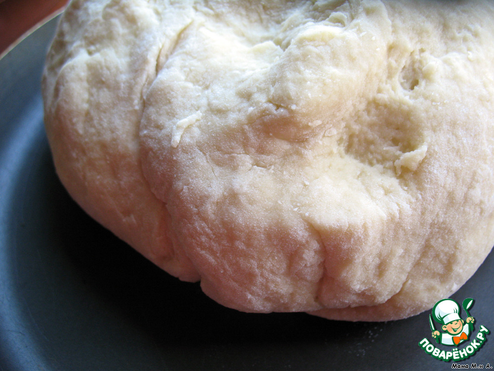 Раскатать тонко тесто, сложить его в несколько раз, опять раскатать по размеру формы. Положить поверх сыра, подоткнув края внутрь. Верх смазать яйцом. Проколоть в нескольких местах для выхода пара.