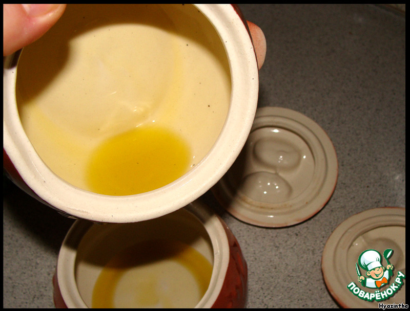 В горшочки налить по 1 ст. л. оливкового масла, покачать горшочки из стороны в сторону, чтобы масло обволокло и стенки.