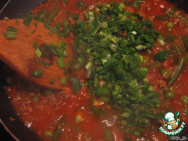 Паста с овощами и мясным фаршем