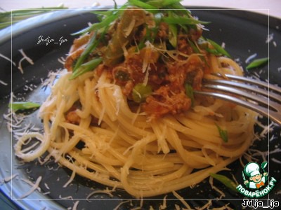 Подаём спагетти с соусом. Я делаю так. Выкладываю часть спагетти на подогретую тарелку, потом соус, затем опять спагетти и соус. Посыпаем натёртым "Пармезаном" и зелёным луком. Можно посыпать чёрным свежемолотым перцем.