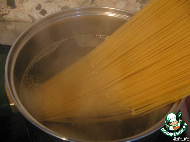 Отвариваем параллельно спагетти в подсоленной воде, до состояния, которое Вы любите. В воду можно добавить немного оливкового масла.