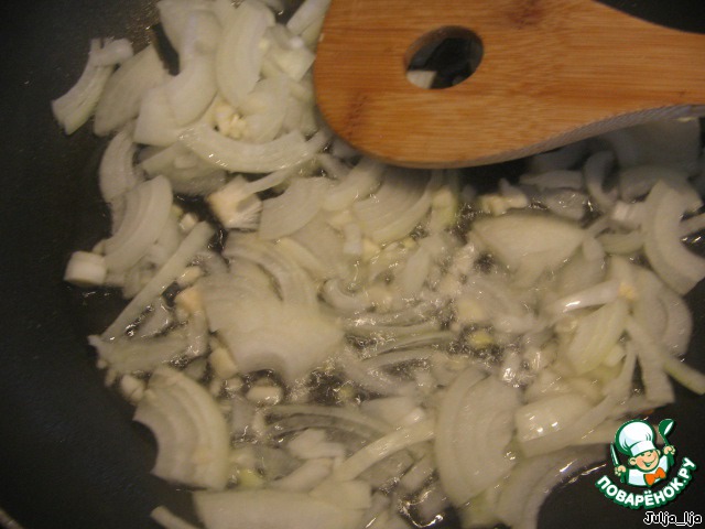 На оливковом масле, обжариваем чеснок, нарезанный колечками, до появления запаха. Чеснок удаляем.
