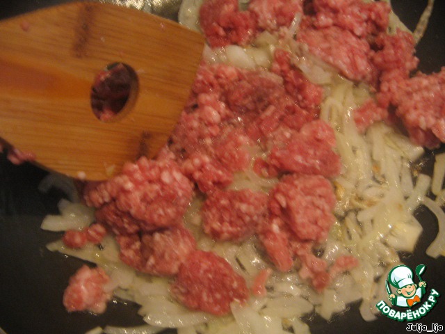 Добавляем фарш. Обжариваем 2 минуты.