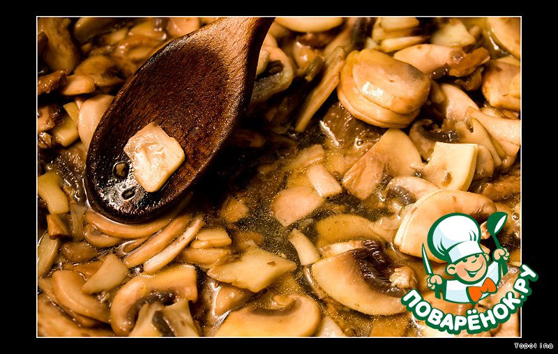 Грибы вымыть, почистить, порезать тонкими пластинками и подрумянить в оливковом масле вместе с мелко порезанным чесноком.