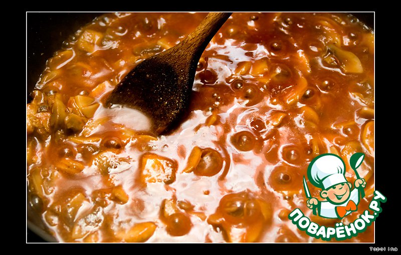 И добавить эту пережарочку вместе с мелко порезанной петрушкой в наш соус. Оставить на чуток, чтобы последние ингредиенты приобрели вкус, смешавшись с остальными составляющими соуса.