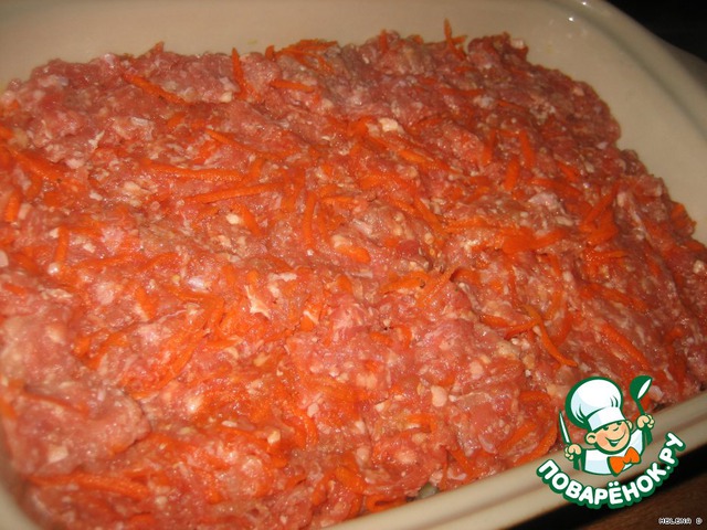 натереть морковь и смешать её с фаршем и приправой,уложить сверху на картофель