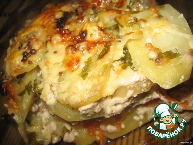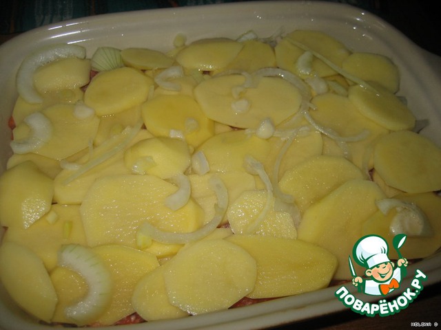 почистить,отварить до полуготовности и порезать картофель,уложить его в форму для запекания+порезанный лук