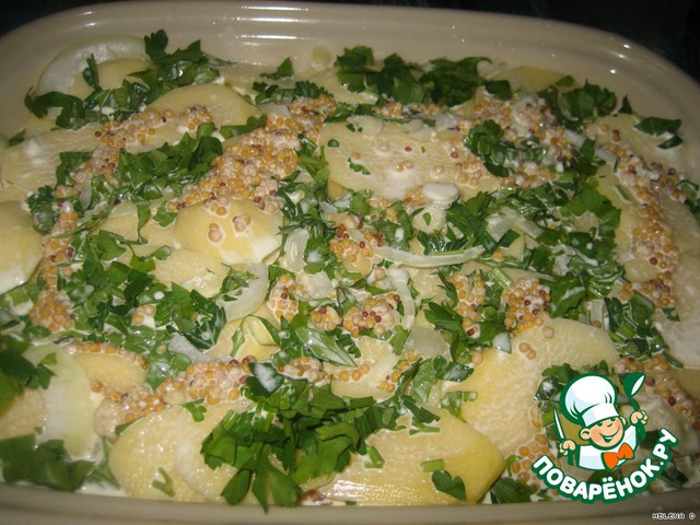 делаем заливку:добавляем горчицу и зелень,заливаем картофель