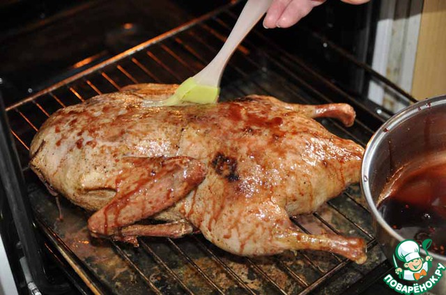 Спустя 2 часа запекания утки, вынимаем её из духовки и кисточкой смазываем гранатовым соусом.