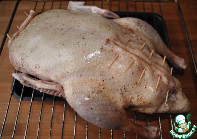 Утку моем, высушиваем бумажным полотенцем, осмаливаем, если есть, остатки перьев. Протыкаем кожу тушки зубочисткой, чтобы облегчить вытапливание жира. Особенно делаем проколы в местах скопления жира.