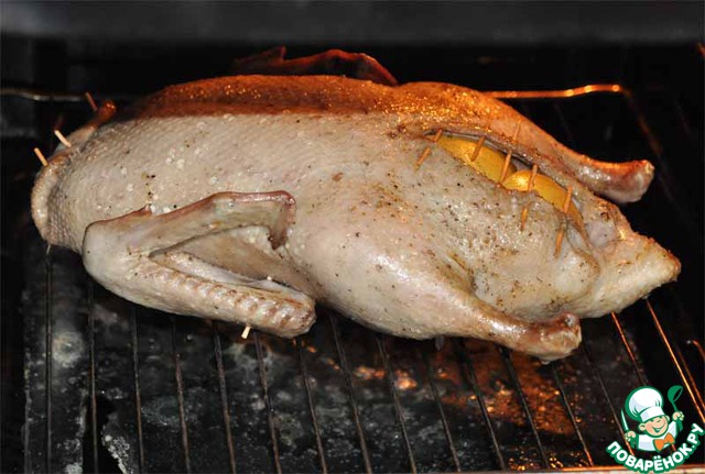 Готовность утки проверяем зубочисткой. Если выделяется прозрачный сок, то утка готова.