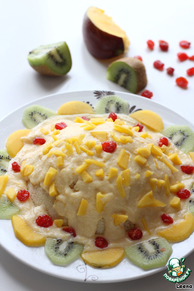 Горку обильно поливаем соусом, украшаем фруктами. Соуса получается довольно много, поэтому им можно дополнительно поливать десерт индивидуально в тарелке :-)