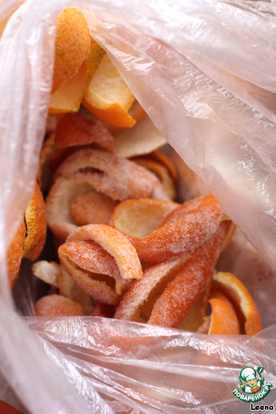 У меня всегда в морозилке хранятся апельсиновые шкурки. Просто я никогда их не выбрасываю, а складываю в целофановый мешочек и замораживаю.