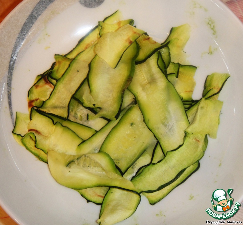 Цуккини промываем и с помощью картофелечистки нарезаем на тонкие ломтики.