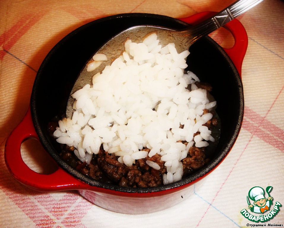 На дно маленьких чугунных кокотниц выкладываем зажарку со сковороды, а после — рис.