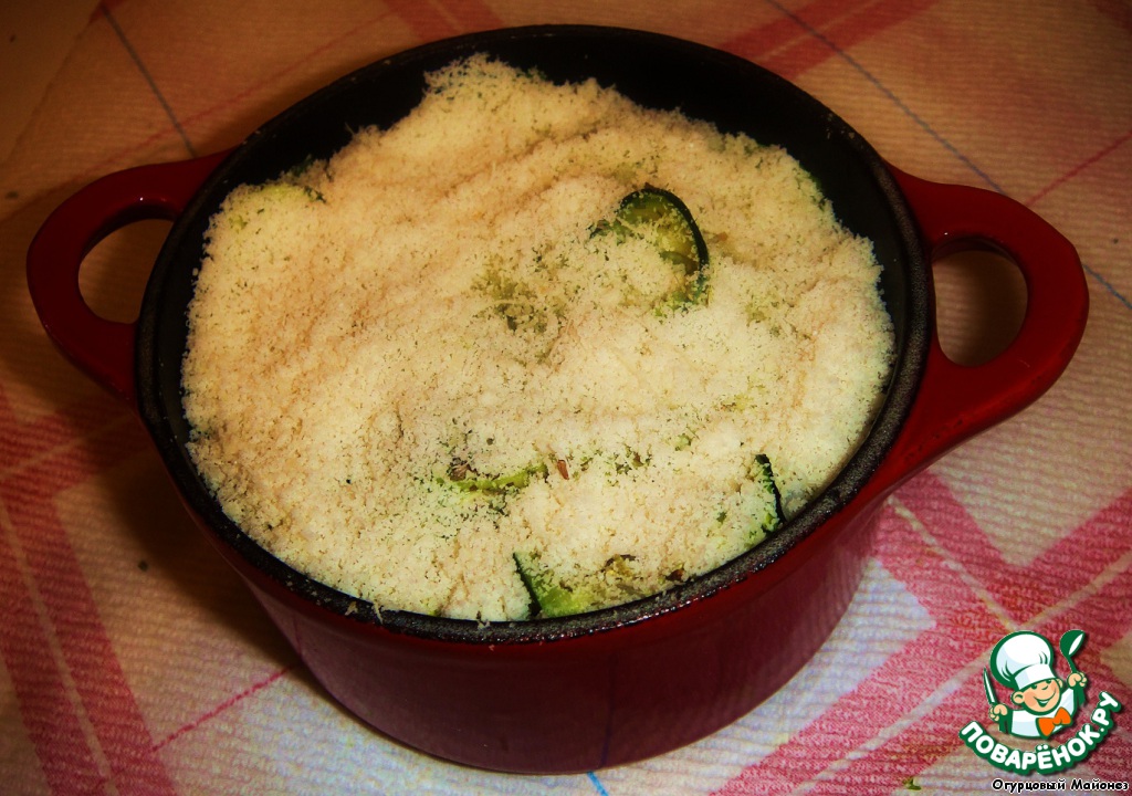 Посыпаем тёртым пармезаном, накрываем крышечкой и ставим в духовку, разогретую до 180 градусов на 20 минут.