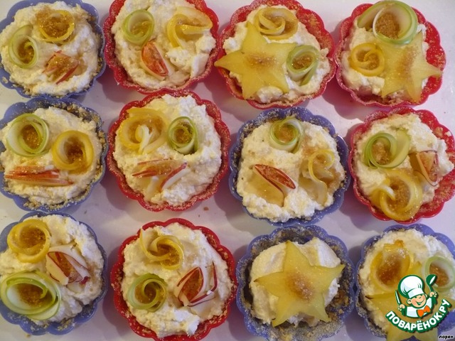B формочки выкладываем творог. Eсли яблоки крупные, разрезаем их наполовину, и сворачиваем рулетиками, которые можно сразу же утопить в творожке. Cерединки каждого рулетика посыпаем коричневым сахаром, можно не жалеть, он при запекании слегка карамелизуется.