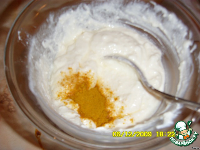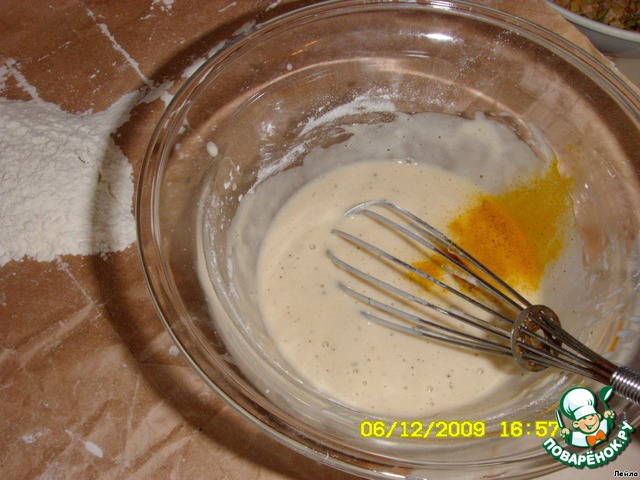 Цвет был серый у кляра, добавила куркуму - щепотку, оставляем на мин.15 кляр.