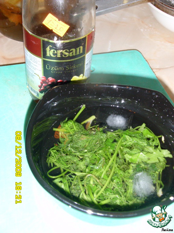 Зелень у меня увяла, чтобы ее "оживить" в чашку наливаем воду + винный уксус (1-2 ст.л.) и кладем лед. Оставить в холоде на 30 мин.-1час.