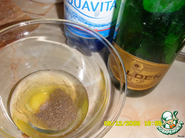 В чашку налить минерал. воду + вино(шампанское), яйцо, посолить, поперчить.