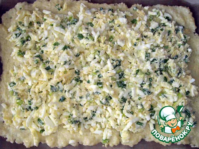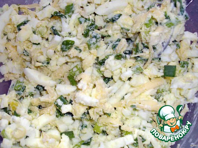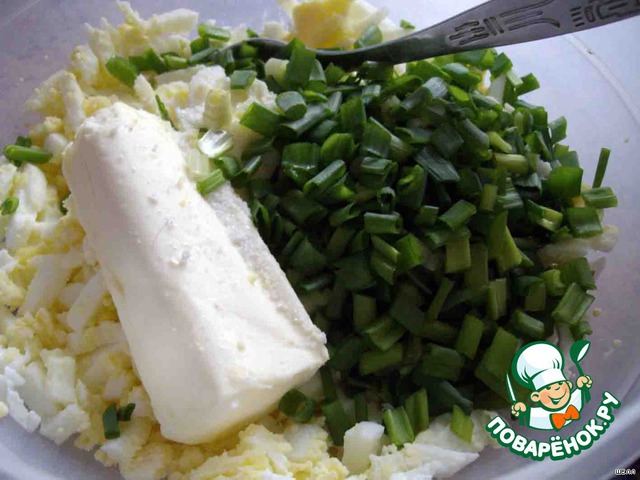 Займемся начинкой: яйца измельчить, добавить лук, масло (комнатной температуры), соль.