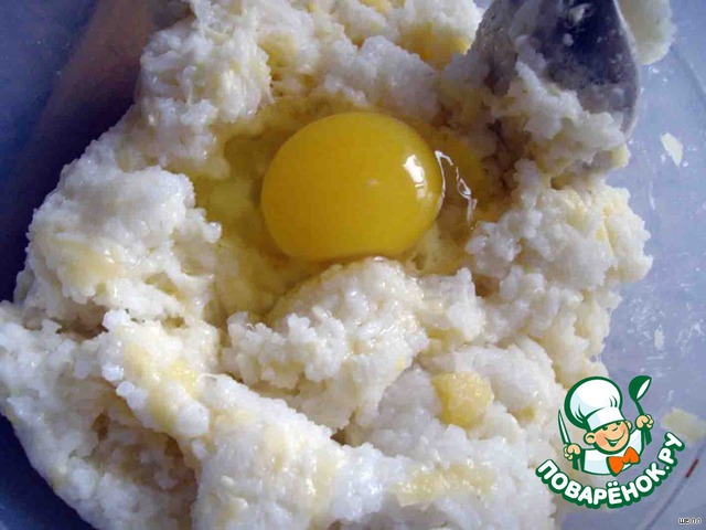 Смешать с сырым яйцом и натертым на крупную терку сыром.