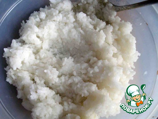 Рис достать из духовки, немного охладить, намазать начинку, свернуть в тугой рулет, положить на противень швом вниз, и опять в духовку минуток на 5.