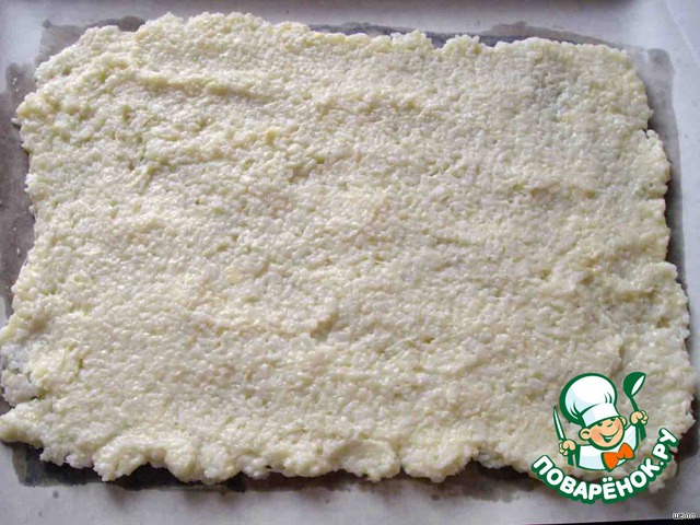 Противень застелить бумагой для выпекания, выложить рис (приблизительно 30*32 см). Поставить в горячую духовку на 7-10 минут. Не зарумянивать!!!