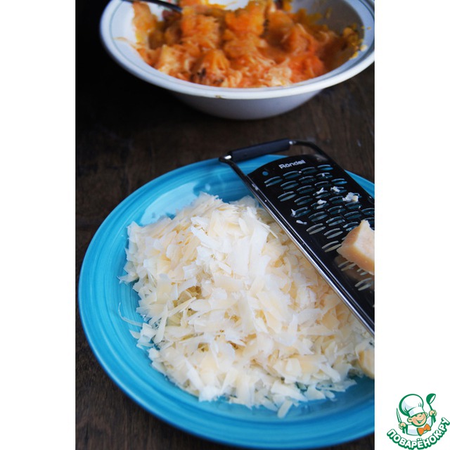 Смешать тыкву и сыр, поперчить. Можно приправить тёртым мускатным орехом. Солить не нужно.