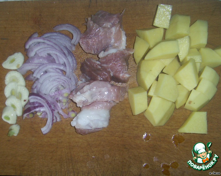 Всё предварительно моем и чистим. Режем картофель кубиками, мясо - кусочками поменьше, лук - полукольцами, чеснок - пластиночками, грибочки - на 4 части.