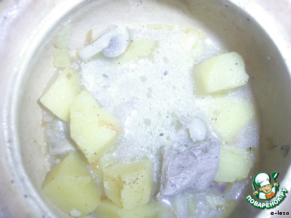 Сверху - соль и специи по вкусу, залить всё бульоном (или водичкой), чтобы на 2-3 см не доставала до верха горшочка (это примерно 150 г воды).