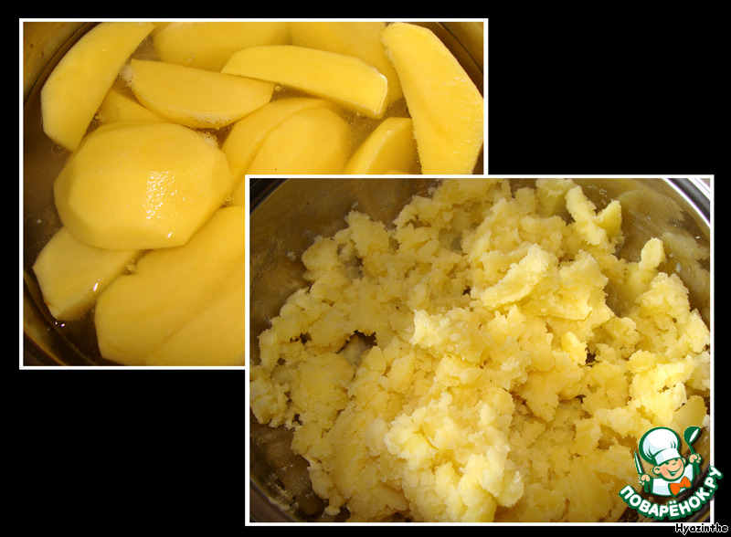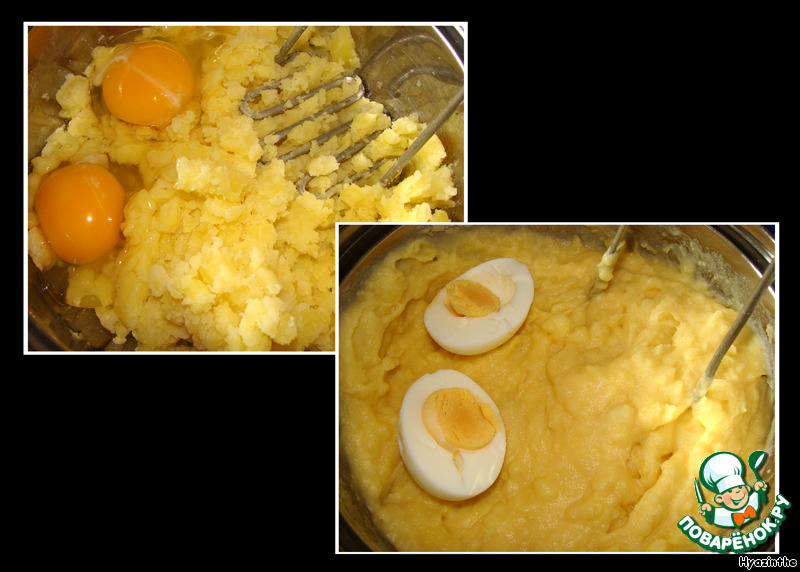 Затем добавляем вареное яйцо и измельчаем его толкушкой, смешивая с картофельным пюре.