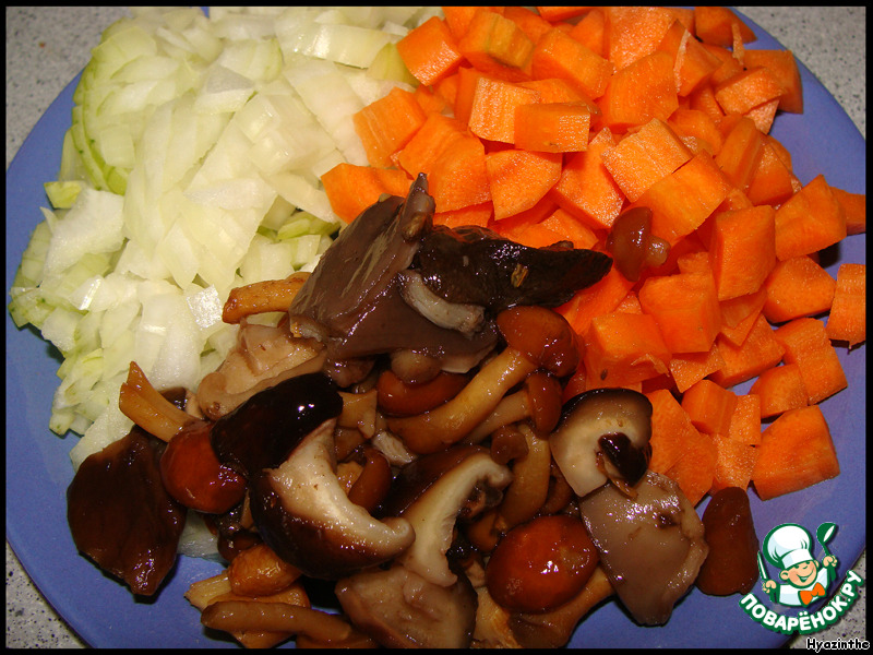 У меня были замороженные лесные грибы, можно взять свежие или консервированные шампиньоны.