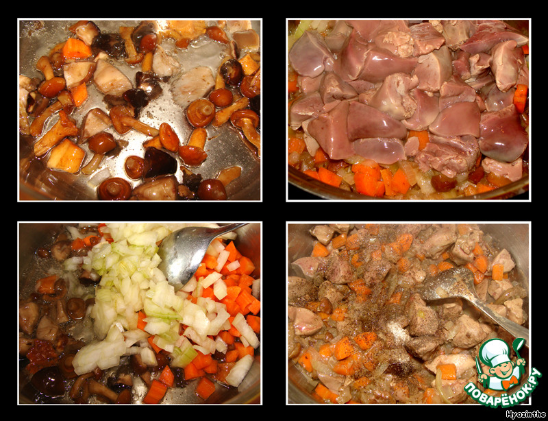 В разогретом растительном масле обжариваем несколько минут грибы (до выпаривания сока), добавляем морковь с луком, жарим минут 5, постоянно помешивая, затем добавляем ошпаренную печень и еще 5 минут жарим.