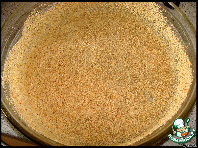 Форму смазываем маслом, обсыпаем сухарями, чтобы они равномерно распределились по форме.