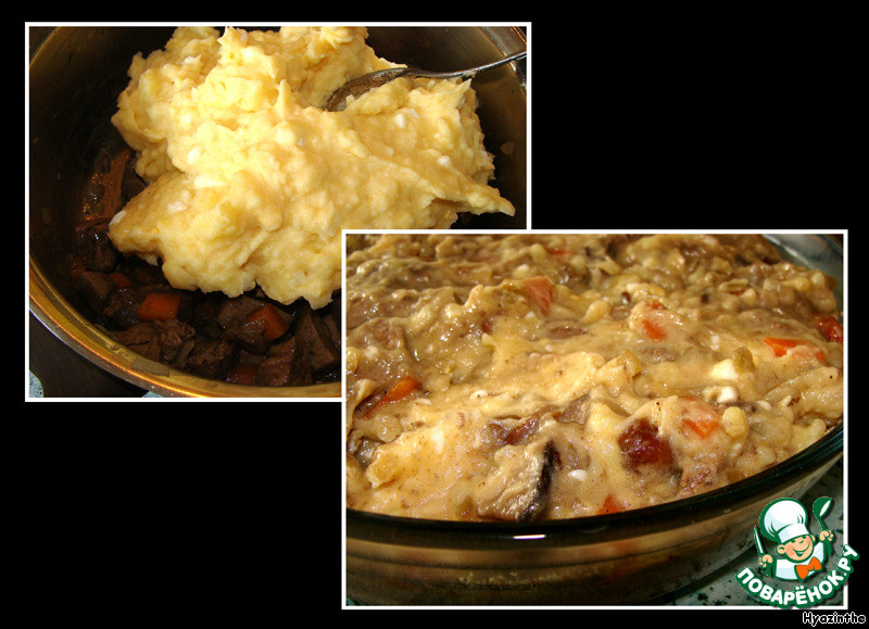 Теперь аккуратно соединяем картофельное пюре с печеночно-овощной смесью и выкладываем всю массу в форму.