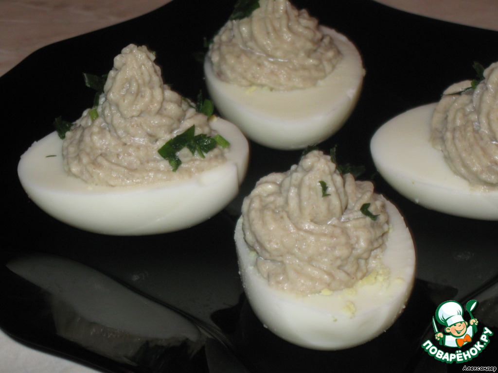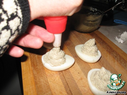 С помощью кондитерского шприца выдавить пасту в половинки яиц. Украсить по вкусу.