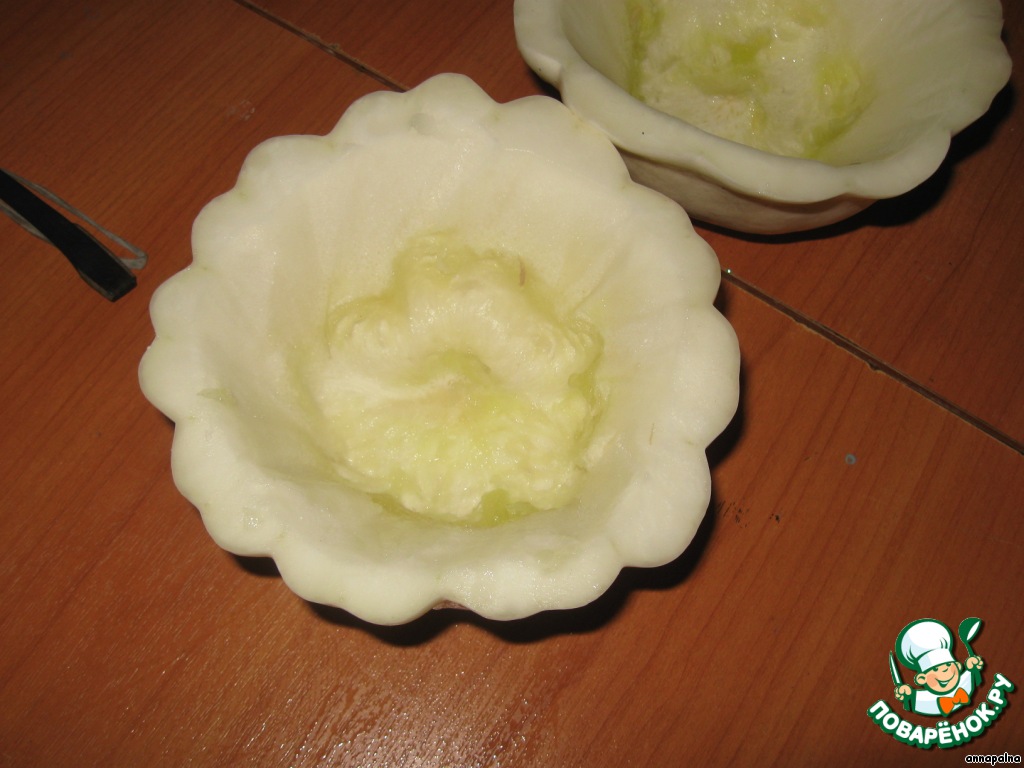 Патиссоны вымыть, срезать верх (крышечкой). Вычищаем - делаем горшочки, семена убираем, мякоть оставляем. Получаются вот такие горшочки.