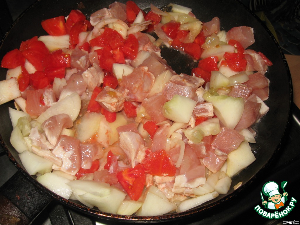 Филе, помидоры и мякоть патиссонов нарезаем на кусочки среднего размера и все вместе с луком обжариваем на сковороде минут 10-15.