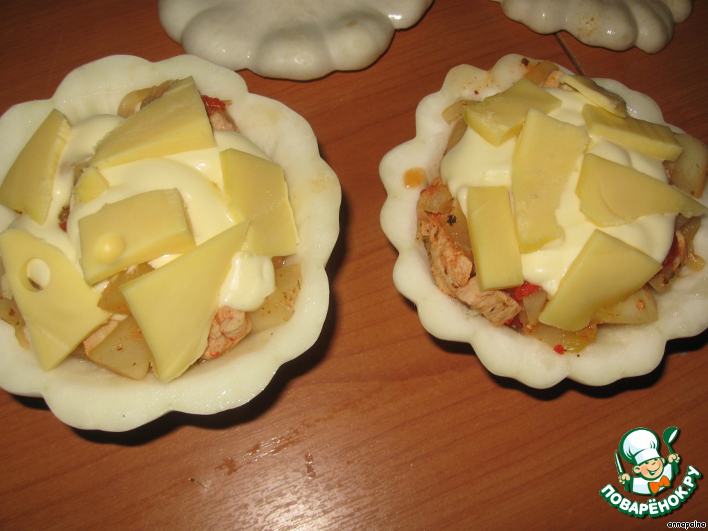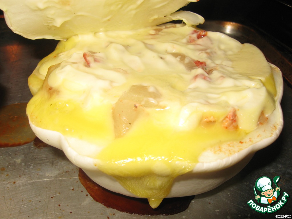 За тем начинку выкладываем по нашим горшочкам, заливаем майонезом и сверху раскладываем кусочки сыра.