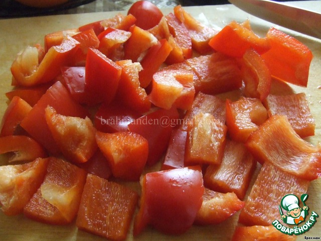 Теперь режем овощи. Перец ---> на красивый квадрат